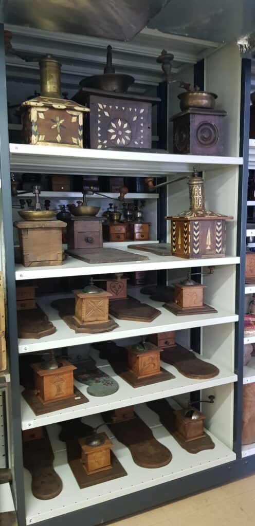 Il faut plus de volume mais pas n’importe comment. Tel un détective, la personne en charge du réaménagement a dû mener une sérieuse investigation. Pour calculer l’espace nécessaire à la collection, notre Sherlock s’est appuyé sur la méthode Walston. Elémentaire mon cher ! Résultat : Deux salles supplémentaires ont été créées. Dès lors, la collection Malongo se divise en trois espaces. Le premier est dédié aux nombreux moulins et objets domestiques, le second aux arts graphiques et le dernier aux herbiers de caféiers. La taille de la réserve c’est fait … place au rangement.